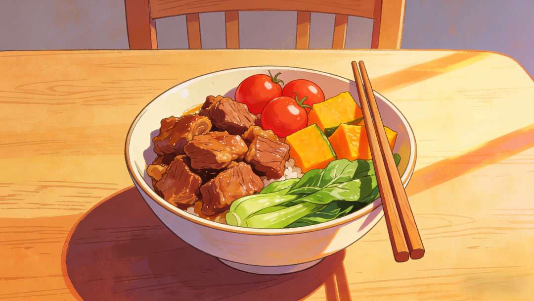 不要只是一碗褐色的卤肉饭。加几个红彤彤的小番茄,烫几颗翠绿的青菜,切几块金黄的南瓜。